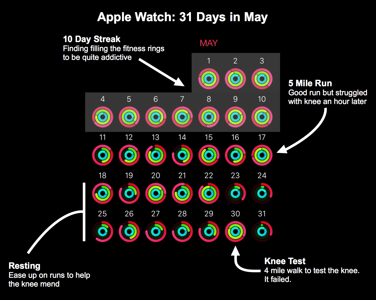 I’ve used a Fitbit for three years so no stranger to the addictiveness of tracking steps and activity but the Apple Watch makes it easy to see visually how you are doing. It’s very clever (apart form the stand metric) and for the first part of May I was determined to complete my circles each day. Extra runs, walks at work, walking to the underground instead of driving into town are all positive activities that I was doing to get my circles filled.